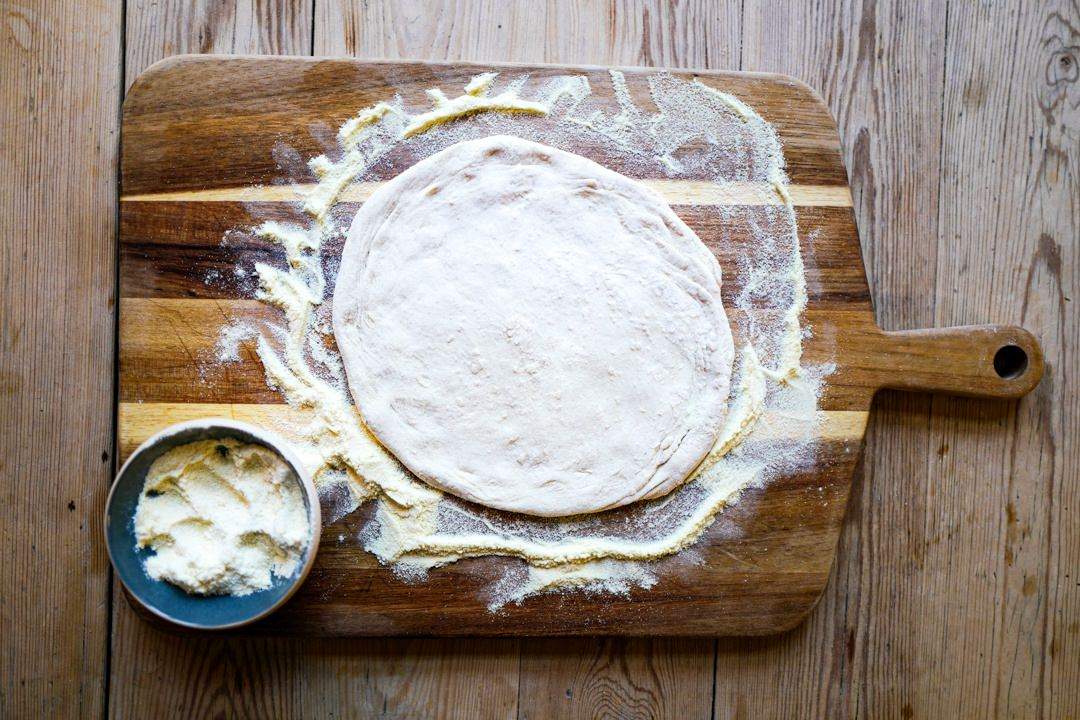 Når du nå skal bake pizza tar du et emne og strekker deigen ut fra midten og ut mot kanten mens du roterer deigen. Resultatet blir en sirkel. Ikke press ut deigen i kanten, men behold en kant som er høyere enn deigen.