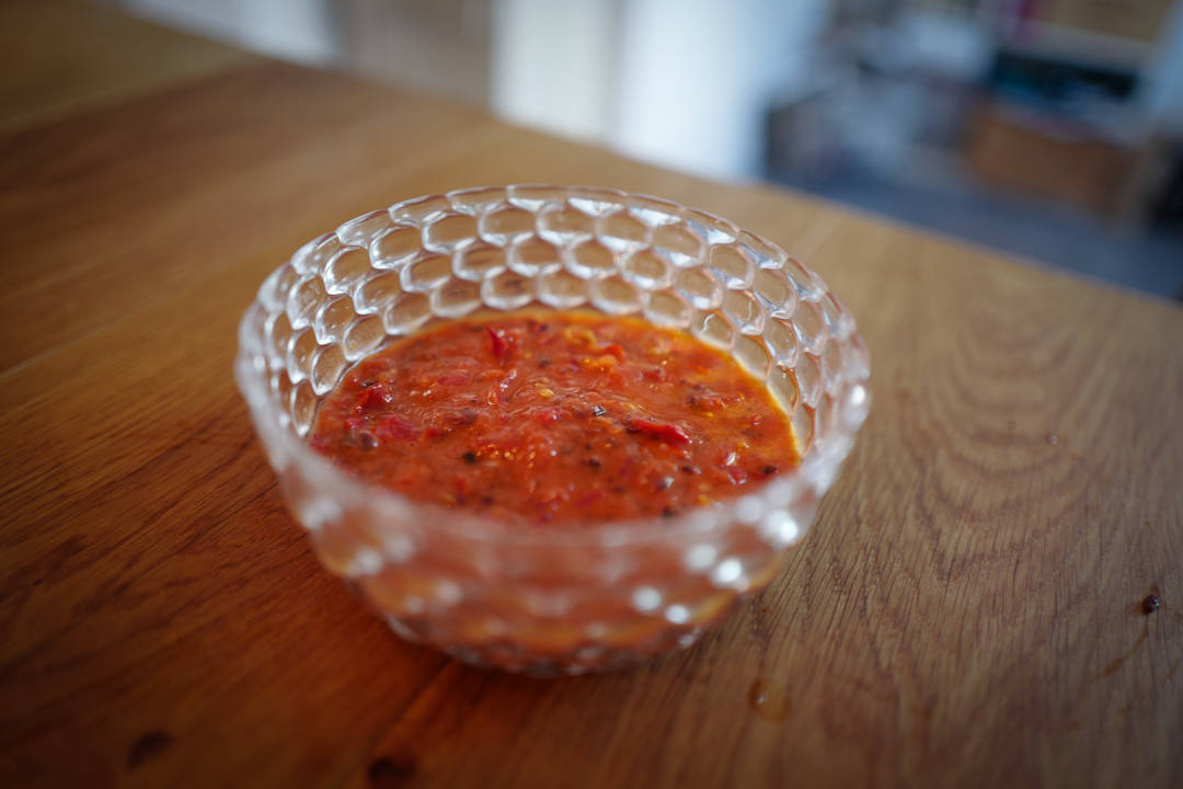 Ha dette i blender og kjør det grovt. Hell over i en sikt og la overflødig væske renne av før du bruker sausen.