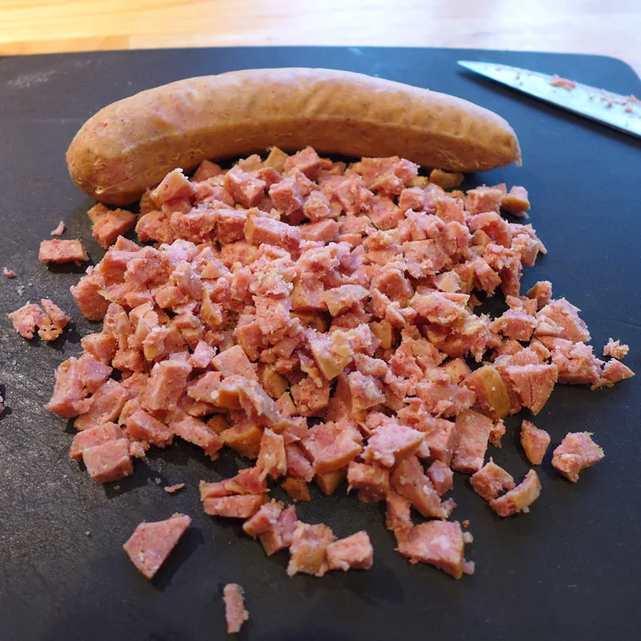 Start med å fjerne skinnet fra pølsene og skjær pølsene i små biter.