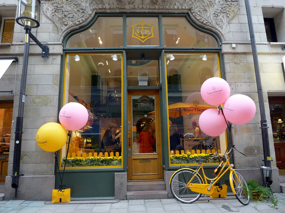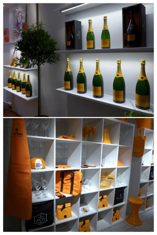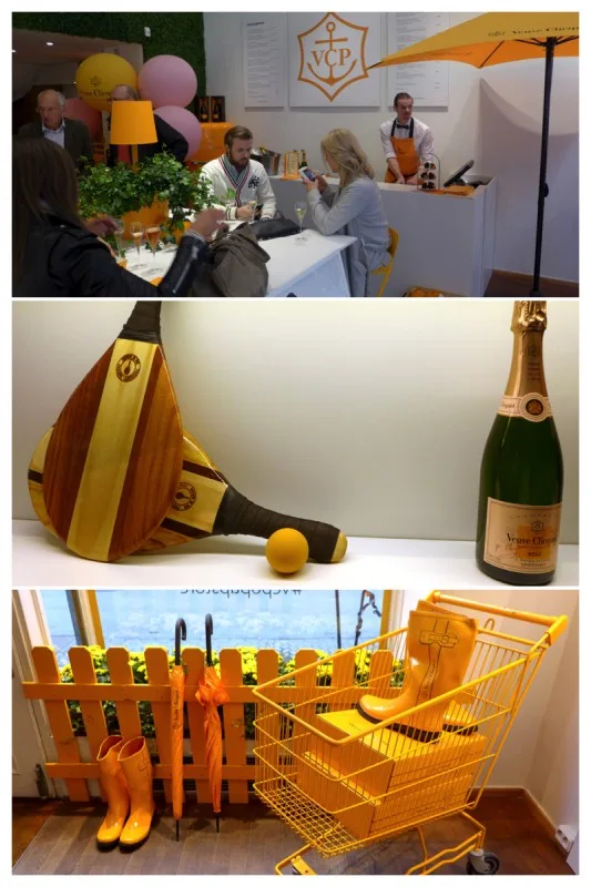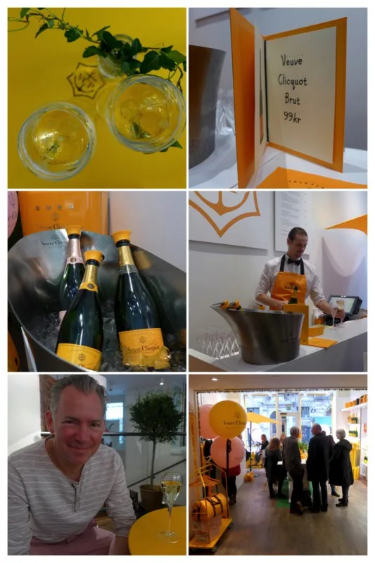 Det ble litt shopping, og shopper man noe dyrt og deilig, må det feires med et glass. Det er slik det bare er. Vi hadde noen par sko å feire, og snublet praktisk talt over en fantastisk pop up-butikk/bar i regi av «Gul enke» , nærmere bestemt Veuve Clicquot Champagne. Foruten å tilby et glass bobler for kun 99 svenske kroner, kan man kjøpe forskjellig stæsj fra champagnemerket. Og hvem trenger ikke et par Veuve Clicquot-støvler når de skal luke i hagen?