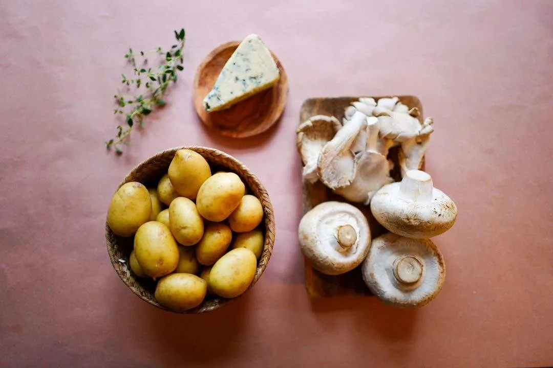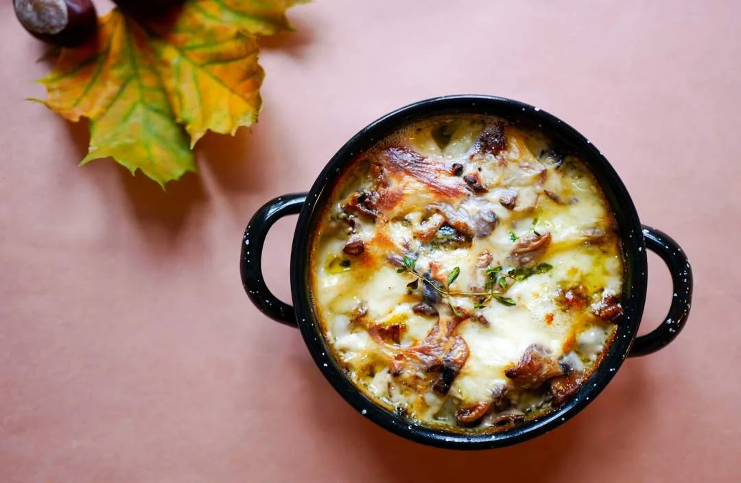 Jeg bruker gule Morenepoteter, et utvalg sopp (her kan du velge helt fritt), bechamelsaus, timian og en Nidelven blå – norsk blåskimmelost fra Gangstad. (Du får den på Meny). Jeg endte opp med å spise hele formen som et måltid, for soppen gjør den mektig nok til å være en rett i seg selv. Synes du blåskimmelost er vel strengt, dropper du det bare eller velger en ost du liker godt. Nå er det altså ost i bechamelsausen, så du får dekket det behovet der hvis du synes det holder med ost.