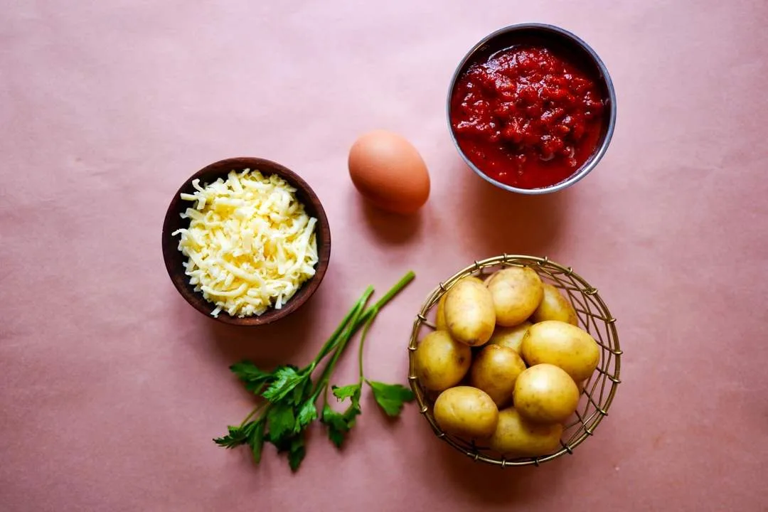 Forkok potetterninger i saltet vann i ca fem minutter. Sil av vannet og ha potetene i former. Hell over tomatsaus og strø over litt persille og revet ost. Stek på 200 grader i ca 30 minutter til potetene er møre. Knekk et egg i hver form og sett tilbake i ovnen til egget har satt seg (ca 5 minutter).