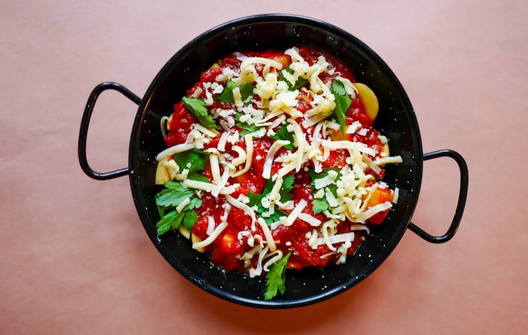 Shakshuka er en deilig frokostrett med grønnsaker, tomatsaus og egg på toppen. Jeg har brukt restesaus etter helgepizzaen og potetterninger foruten ost og egg. Det ble supergodt! Lag dette som porsjoner slik at hver person rundt bordet får hver sin rett. Da kan man sitte å dyppe brød og spise rett fra formen hvis man vil det.