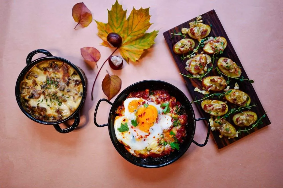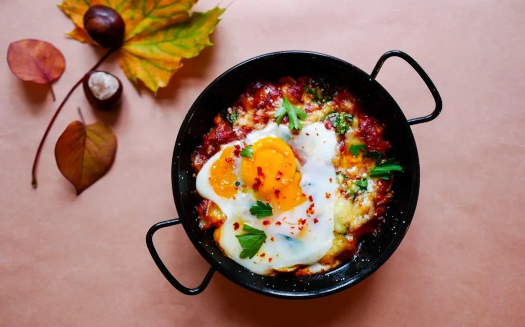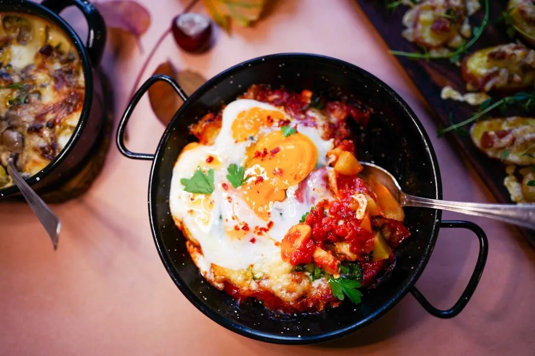 «Shakshuka» med tomat, potet, ost og egg