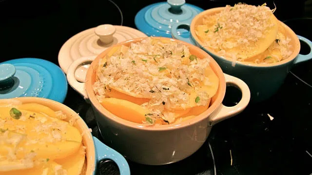 Jeg lager ofte små posjonsgryter med gratinerte poteter, gjerne til vilt eller lam. Jeg varierer ofte hva jeg smakssetter potetene med. Det kan være litt gresskar, pastinakk, sellerirot eller persillerot. Denne gangen lagde jeg potetform med persillerot og røkt kvalitetsbacon.