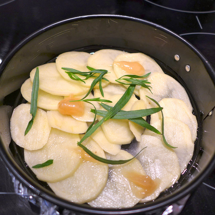 Så lager du sausen. Ikke vask pannen etter å ha stekt andebrystene. Hell på et glass vin. Gjerne Gewurstraminer, for den er herlig parfymert. La vinen koke bittelitt inn slik at alkoholen fordamper. Tilsett 2 ss honning i pannen samt 1 ss grovhakket estragon. Kok inn til halvparten og tilsett 2 ss smør og saften fra en halv sitron. Smak til om du trenger mer honning eller sitron.