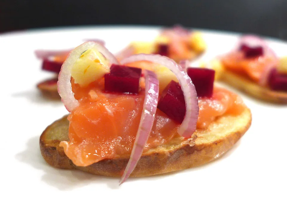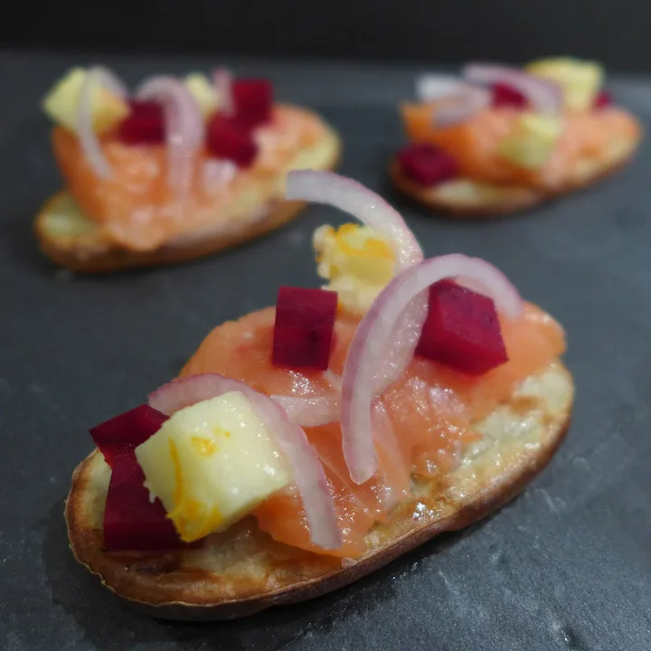 I år har jeg en spennende rett med ovnsbakte mandelpotetskiver, eple med appelsin og pepperrot, lynsyltet løk og rødbeter. Dette er den perfekte fingermaten eller forrett.