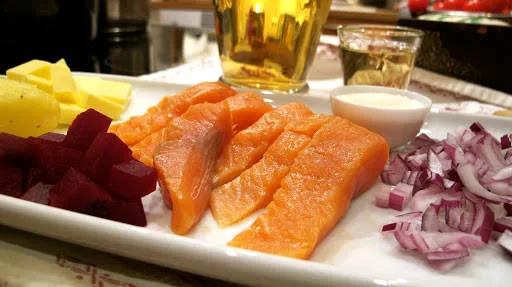 Jeg har alltid kaldt meierismør i terninger, rødløk, rødbeter, rømme, mandelpotet og flatbrød til. Jeg er ikke vokst opp med lefse til rakfisken, så det bruker jeg ikke.