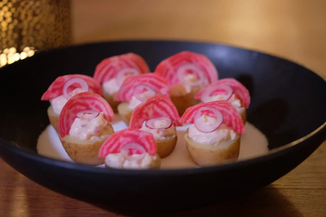 Velg små poteter. Potetene koker du med skallet på i vann som er tilsatt ca 5 % havsalt. Kok til potetene er møre og vannet fordamper rundt potetene og etterlater seg et saltlag. Ta poteten ut av vannet og la dem avkjøles på benken. Del så potetene i to og grav ut et hull i midten med et eplejern. Fyll potetene med rakfiskmousse og sett dem i en bolle med fint salt i bunnen slik at de står støtt. På toppen pynter jeg med en tynn skive polkabete og en ring rødløk. Dette er den perfekte fingermaten til cava! Du kan bruke biter av flatbrød til rafiskmoussen i stedet for poteter hvis du vil gjøre det enklere.