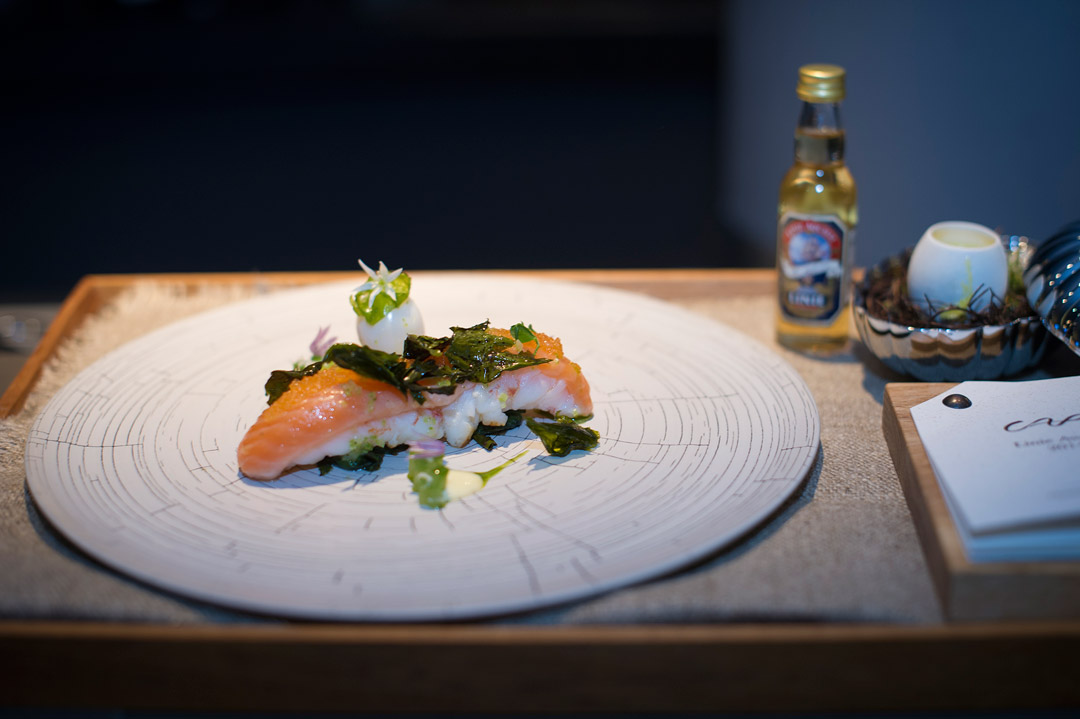 Så er det Even Ramsviks tur til å lage en rett til oss. Nydelig laksetartar med vakumert agurk, tempurakrønsj, tang og revet pepperrot. En frisk og herlig rett.