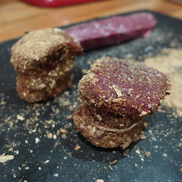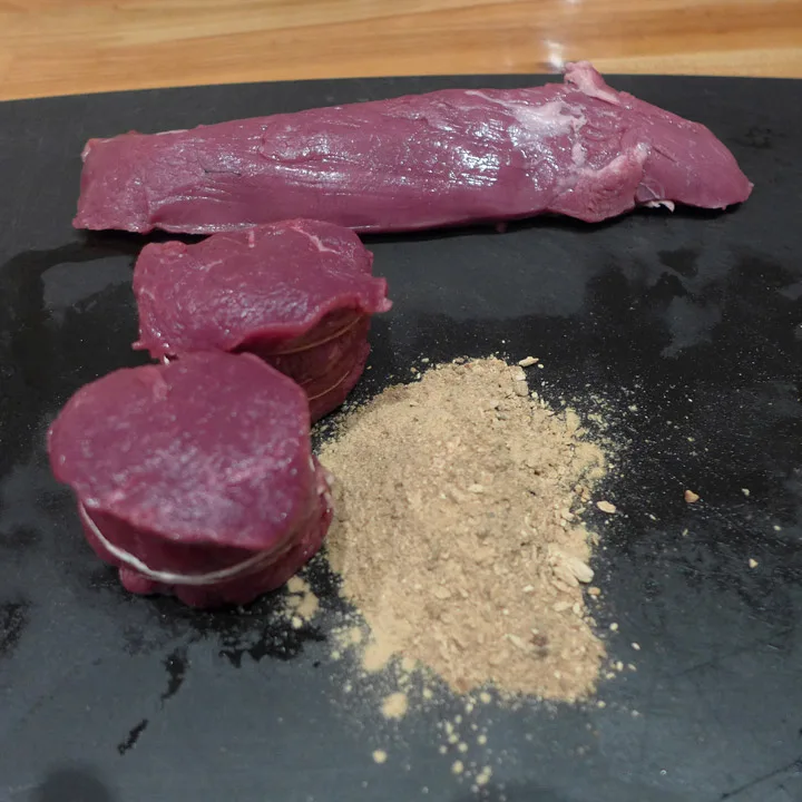 Jeg fikk en flott indrefilet og en ytrefilet levert på døra og gikk straks i gang med å planlegge et godt måltid. Norske smaker var det jeg ville gå for og jeg ville dra skogen inn på kjøkkenet. Derfor tok jeg en god neve tørkede steinsopp og kjørte dem til støv i blenderen. Det skulle være krydderet mitt sammens med salt og pepper.