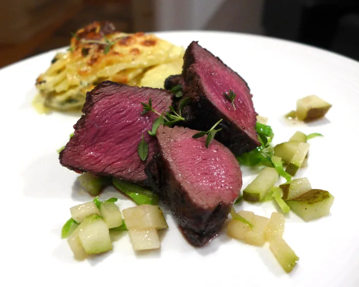 Legg et stykke potetkake på tallerkenen og legg på kål og pære. På toppen legger du noen stykker av indrefileten og biffen. Pynt med frisk timan og nyt skogens herlige smaker.