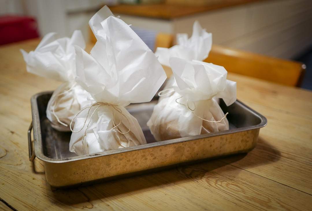 Potene baker jeg i bakepapir. Jeg prøver å bruke minst mulig aluminiumsfolie og bakepapir er et fint alternativ. Legg hver bakepotet i midten på et bakepapirark. Pakk sammen og knytt igjen med mathyssing slik at pakken er tett. Bak i ovnen på 200 grader til potetene er myke. Press på hver side av poteten for å avgjøre om poteten er ferdig eller ikke. Å bake poteter tar tid, så sett av et par timer. Baketiden kommer helt an på hvor store potetene er.