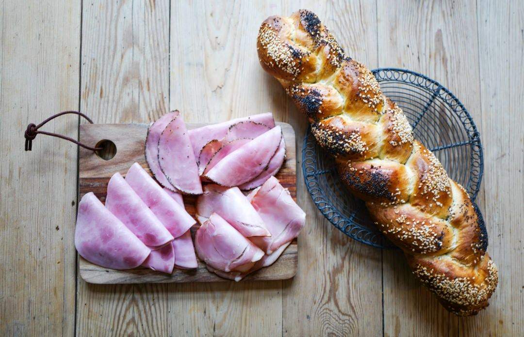 For meg fungerer det helt topp. De tre forskjellige skinkene har jeg plassert på hver sin plass på langgangen. Hamburgerrygg til venstre, så pepperskinke og kokt skinke i den andre enden. Min langgang var på 44 cm, dere! Det er mye brød! Oppskriften på brødet får du straks. Den er perfekt til to flettebrød.
