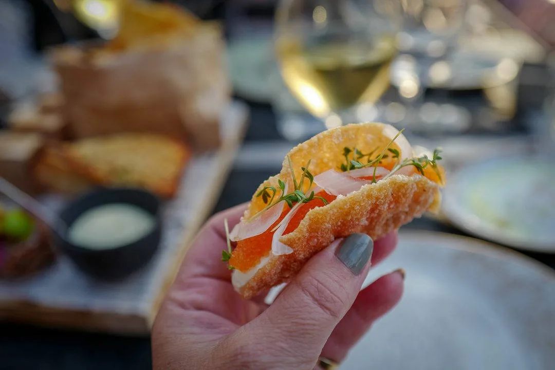 Taco (laget av gyozo-deig) med løjrom, yuzu-crème fraîche og syltet løk. For en fantastisk munnfull!