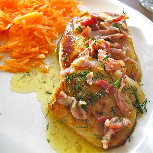 Server fiskepuddingen med gulrøtter som er revet og krydret med sitronsaft, kokte poteter og smeltet smør tilsatt bacon og dill.