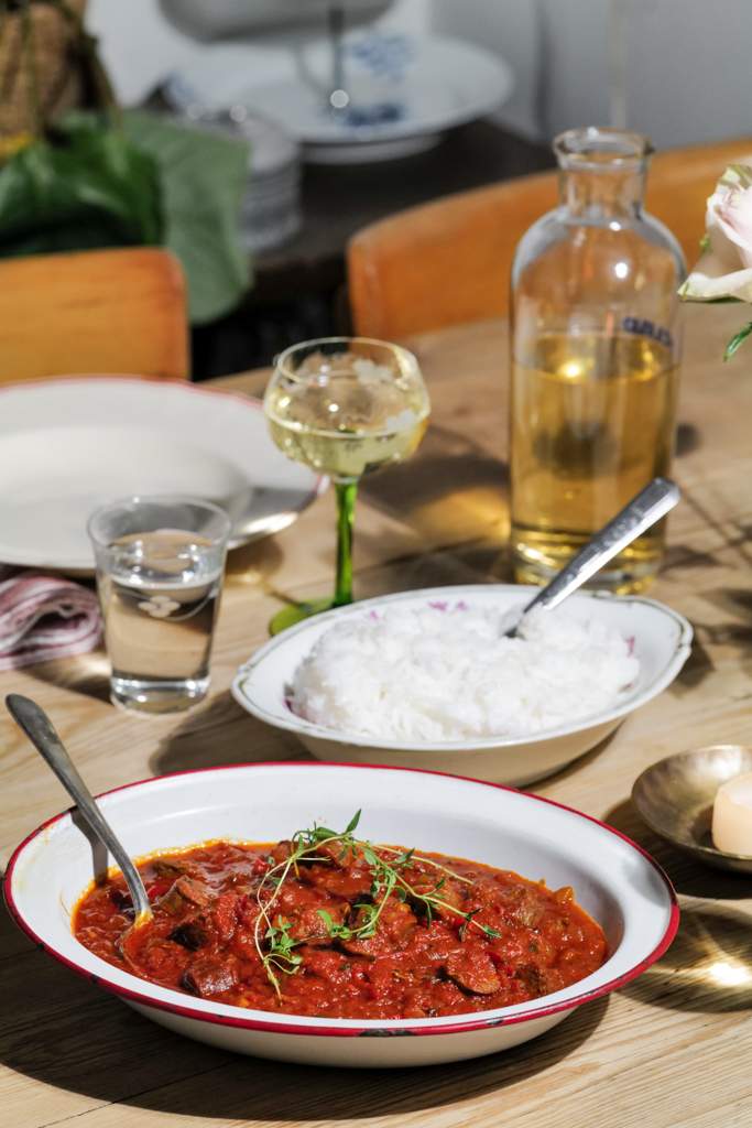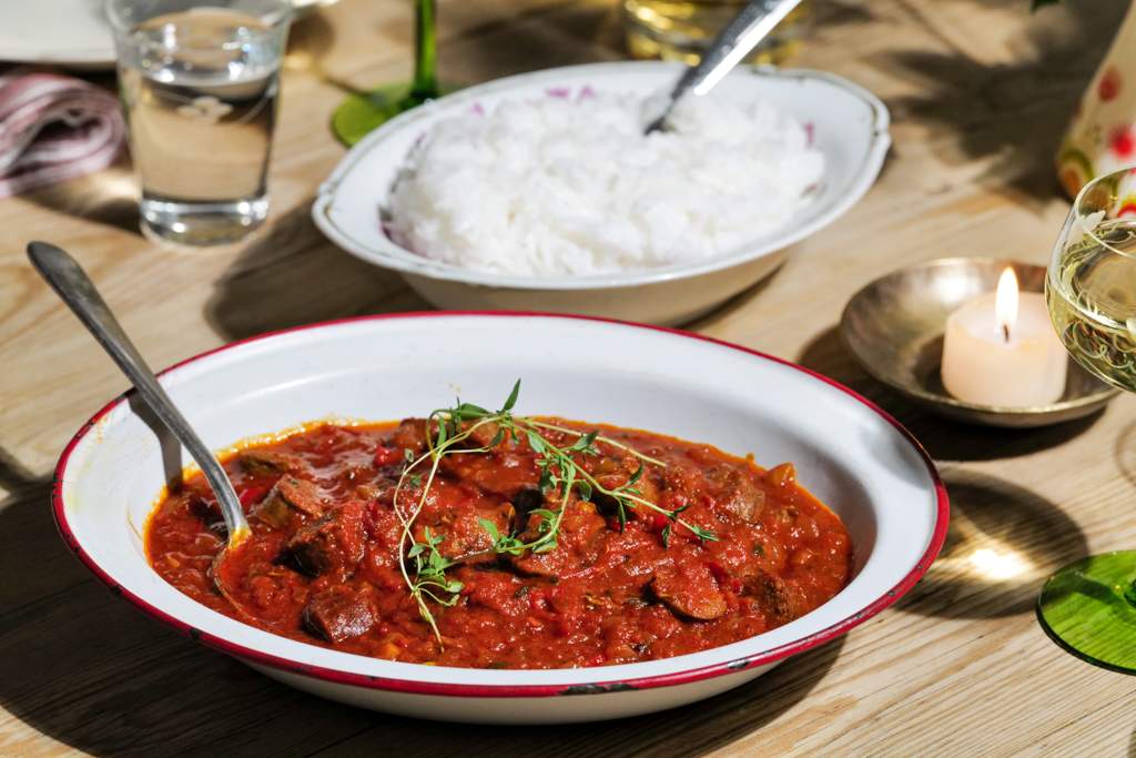 En rett jeg har laget mange ganger etter mine turer til Mauritius er Rougaille saucisse. Dette er gatemat og hverdagsmat. Det er en rett alle vil like, for dette er god gammeldags pølsegryte. På Mauritius bruker de timian i mange retter – også i denne kreolske retten. Friske bunter med den deilige urten ligger på markedene og frister. Sausen lages av løk og tomat med en tøtsj av ingefær, hvitløk og paprika. Retten er enkel å lage og den smaker deilig med ris til.