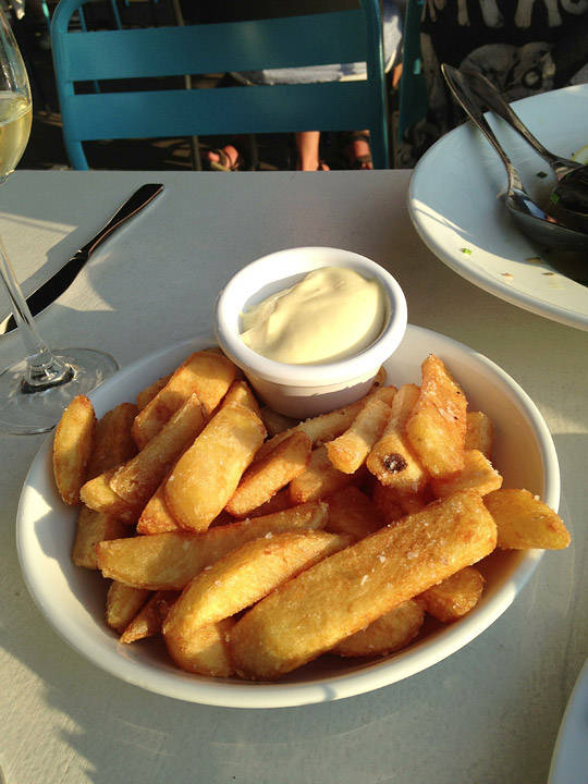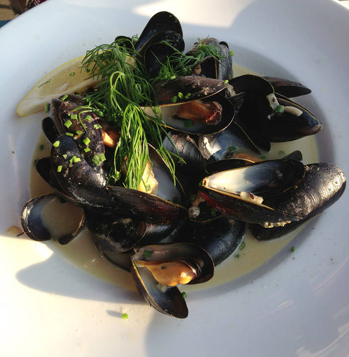 Vi er heldige å få et bord på ytterste rekke. Dvs utsikt over Oslofjorden og nærhet til sjø og båter. Det lukter deilig solvarm tjære og salt sjø. Menyen på stedet går i fish’n chips, moules frites, burgere, salater, sandwicher og fisk. Det er rimelig og det er godt. servicen er utmerket også.
