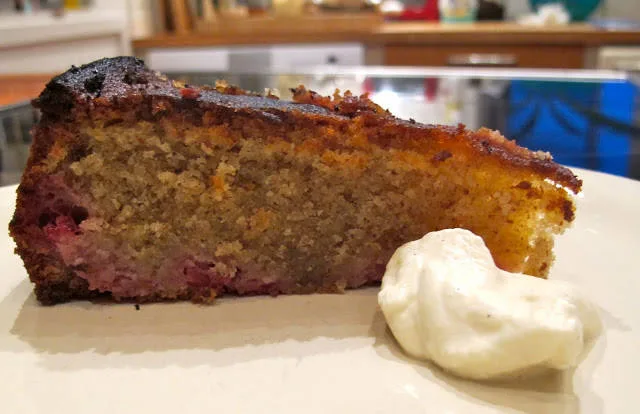 på toppen legger du 300 g bringebær og presser dem forsiktig ned i røren.