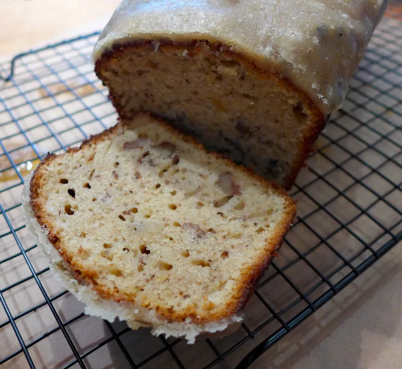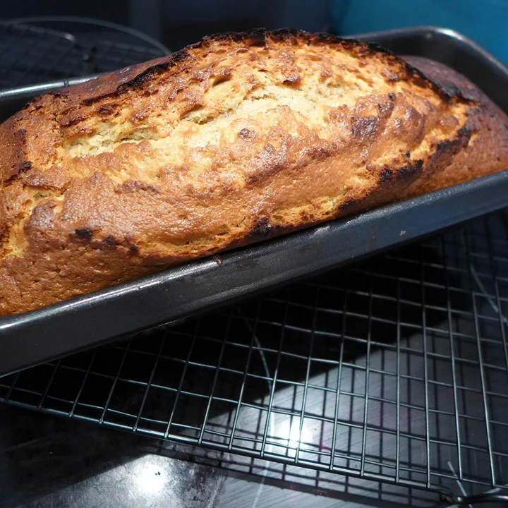 Smør en brødform og hell røren i. Sett i en forvarmet ovn i 35 minutter på 210 grader, varmluft. La kaken kjøle seg ned på en rist etterpå.