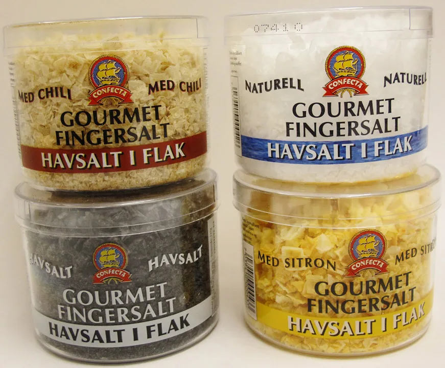 I større matbutikker selges disse flotte boksene med smakstilsatt salt. Sitronsalt er godt på grillet fisk. Sort salt smaker ikke noe annet, men er dekorativt på lyse retter. Saltet med chili gir en ekstra liten spiss på et stykke grillet kjøtt.
