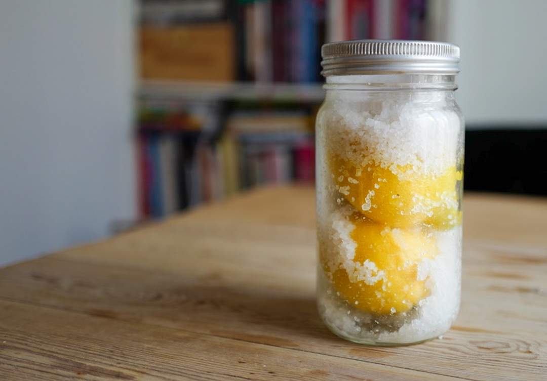 Vask sitronene grundig. Skjær hver sitron i fire båter uten å skjære helt ned igjennom hele sitronen. Ha en liten neve salt i glasset. Press ned en av sitronene i glasset og press salt inn i sitronens kjerne. Fyll på med mer salt og gjenta prosessen med de to andre sitronene. Pakk det hardt og fyll godt med salt på + sitronsaften. Skru på lokket og sett det på benken. Snu glasset/rist på glasset hver dag og sørg for at sitronene ligger under salt eller væsken som dannes av sitronen og saltet. La glasset stå i 30 dager før du bruker av det. Når du skal bruke sitronen skjærer du av det du trenger (en «tunge» er nok til å gi smak til en hel rett. En «tunge» er en fjerdedel av sitronen, altså en av båtene som du har skåret sitronen i). Skyll godt og riv av innmaten og skjær bort det hvite av skallet. Det er kun den gule delen av skallet som skal brukes. Skjær det i små terninger (og da mener jeg små, altså) og bruk det i en rett. Det vil passe perfekt på toppen av et stykke dampet fisk. Perfekt i en kyllingsalat med rømmedressing eller majones. Og på en vitello tonnato er den himmelsk!