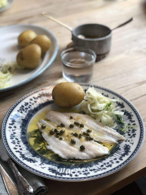Vi hadde smørflyndre med brunet smør, kapers og fennikelsalat i går og selvsagt med små terninger av saltsyltet sitron på toppen. Så godt!