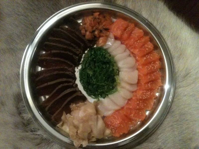 På Fjelberg fisk og vilt i Bygdøy alle får du kjøpt disse fantastiske sashimifatene til 247 kr. De inneholder masse laks, kamskjell, tunfisk stekt såvidt i kanten, syltet ingefær og sjøgress. De selger også sin egen ponzusaus, skulle man ha lyst på det.