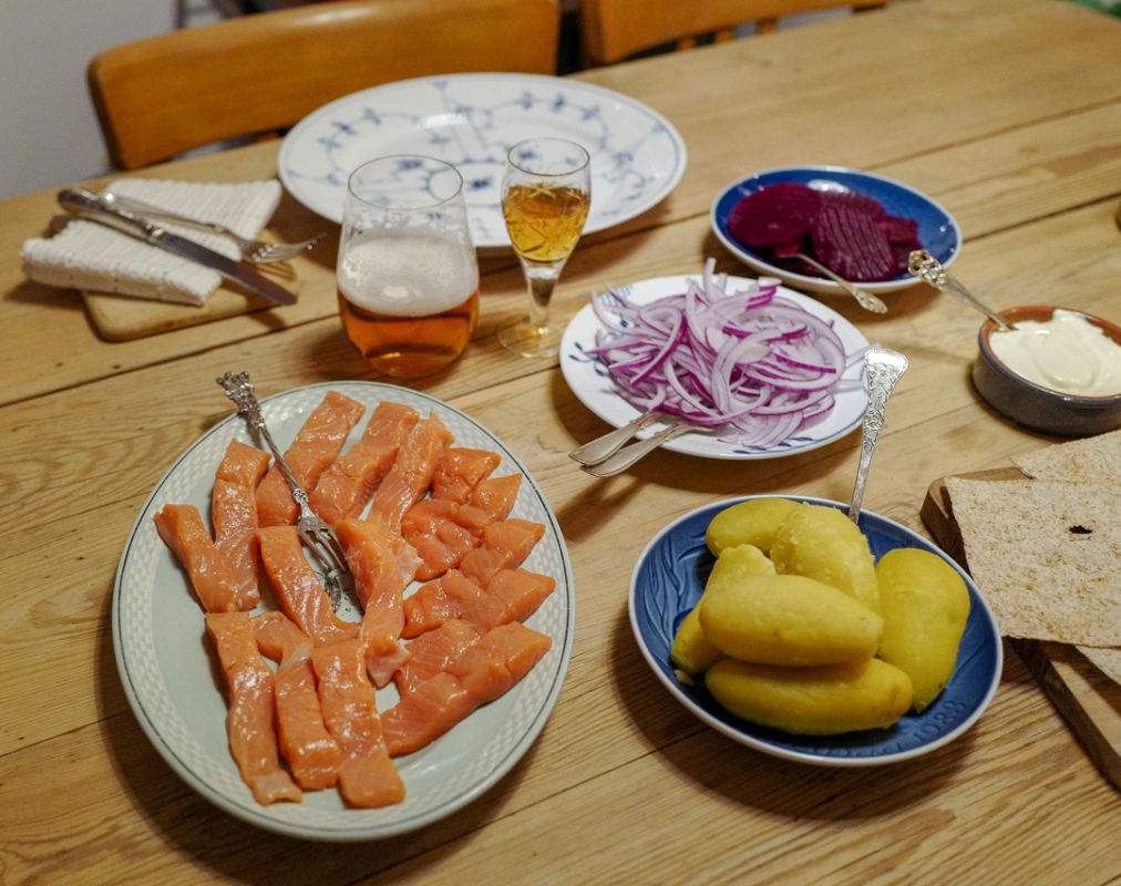 Da dekker jeg opp fint med alt tilbehøret og god drikke. Jeg har prøvd mange forskjellige drikker til rakfisk: Rosévin, champagne og hvitvin. Det fungerer kjempebra. Men av og til er det øl og akevitt som er det perfekte følget. Slik ble det denne kvelden. Faktisk ble det seks forskjellige akevitt.