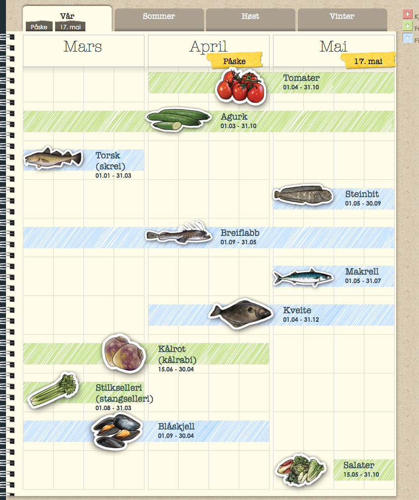 Meny har lagt ut på hjemmesidene en praktisk sesongkalender de rman kan se råvarer som er i sesong akurat nå. Den går selvsagt over et helt år.