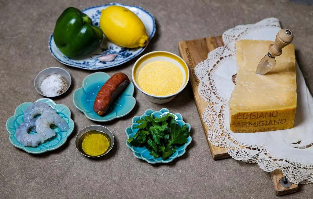 Og det er slik jeg gjør det med denne retten. Jeg tar Shrimps & Grits-retten fra Alabama som inspirasjon, men jeg bruker Parmigiano Reggiano for å få en enda mer definert smak. Jeg bruker fersk chorizo og grønn paprika i tillegg til litt hvitløk og selvsagt reker.