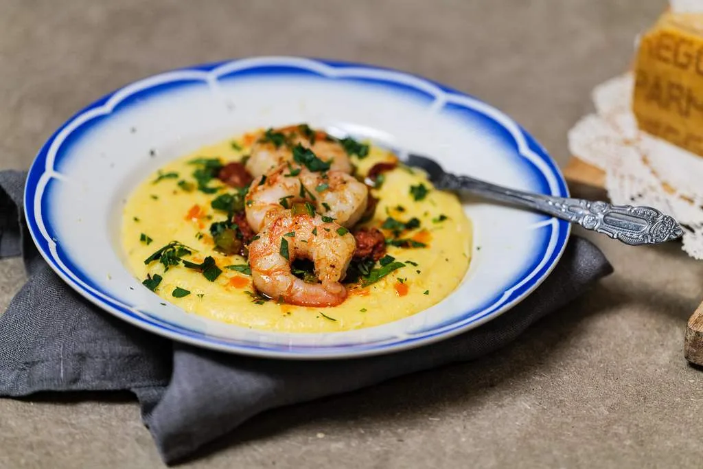 Her kommer oppskrift på Shrimps & Grits eller Polenta med pepperoni og reker.