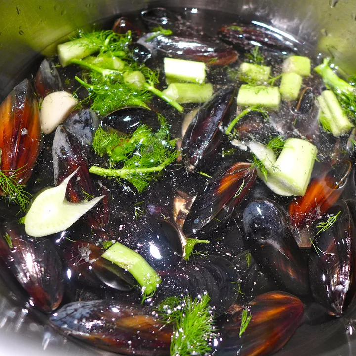 Damp blåskjellene i en kjele med 2 dl vann, en skvett hvitvin og to hvitløksfedd som du gir et kakk slik at de sprekker. Skjær også av toppen på fennikelen (stilkene som stikker opp av knollen) og legg dem i gryta. Sett på lokk. Skjellene skal akkurat åpne seg. Dette tar ikke mange minuttene. De som ikke åpner seg, kaster du.