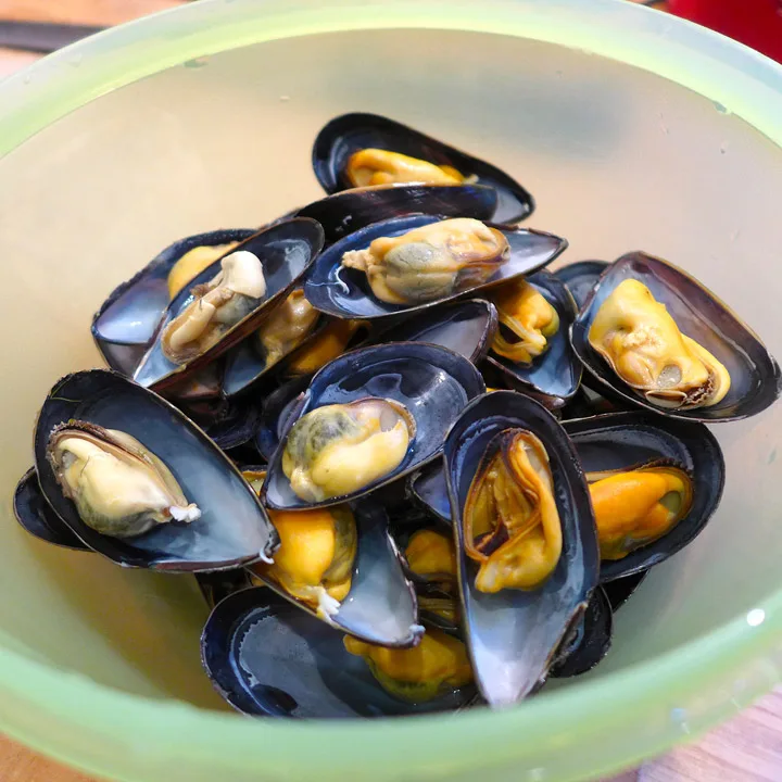 Når du kommer hjem fra butikken har du blåskjellene over i en bolle og setter den i kjøleskapet. Blåskjell er levende og det skal de forbli frem til tilberedning. De kveles i en lukket pose. Når du skal bruke skjellene heller du dem over i en bolle med iskaldt vann. Rens for «skjegg». Skjell som er skadet eller ikke lukker seg i kaldt vann, kastes.