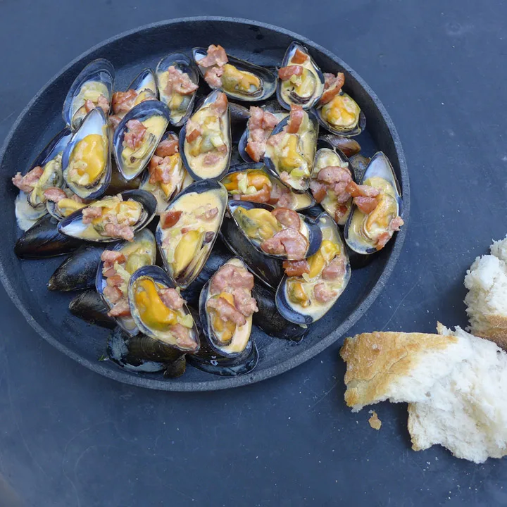 Ta av lokket og legg blåskjellene på toppen av de tomme skjellene. Server med et stykke godt brød til og en iskald øl. Glade gjester. Populær vertinne!
