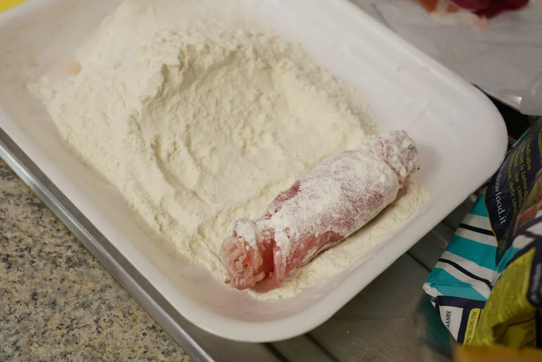 Legg en skive parmaskinke på hver svinefilet. Strø på noen skiver av trøffelblandingen og et par skiver Parmigiano Reggiano. Rull sammen kjøttet til rullader. Vend i hvetemel.