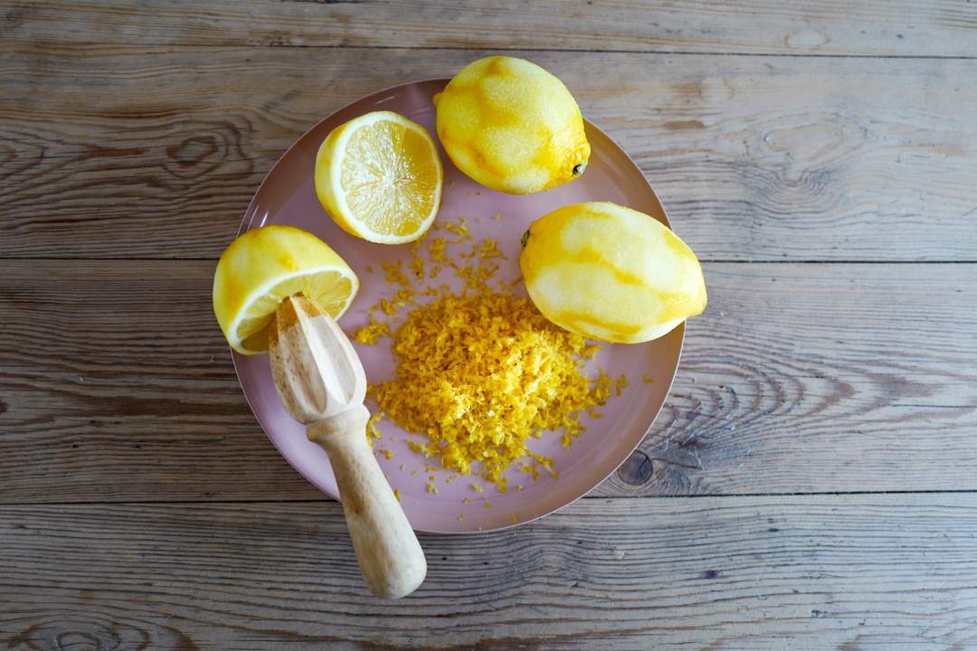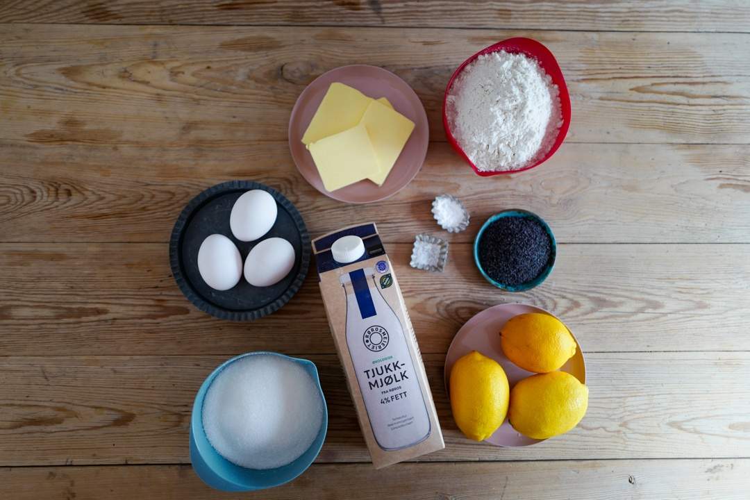 - Bland sammen de tørre ingrediensene: Mel, bakepulver, salt, valmuefrø og sitronskall.