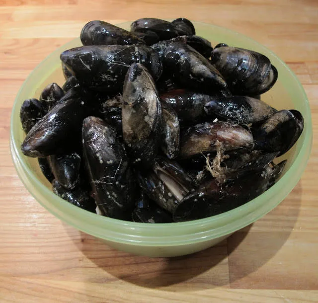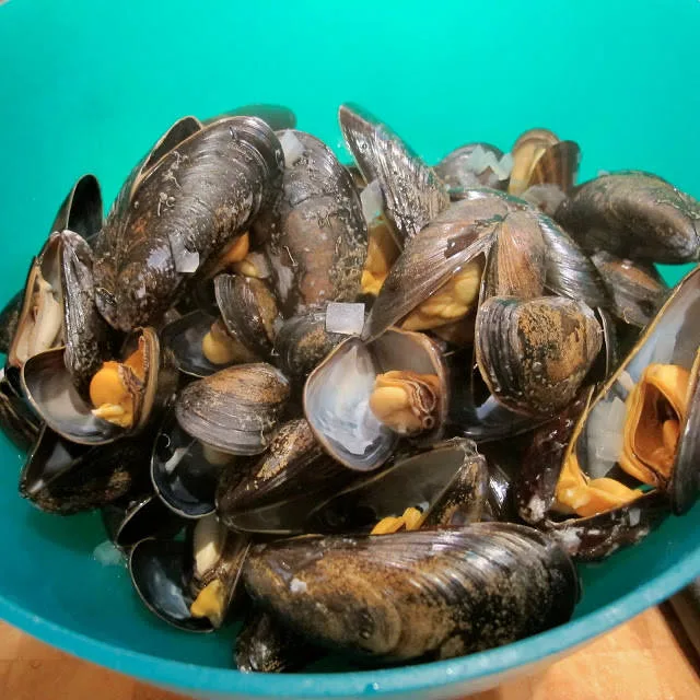| Ferdigdampede blåskjell klare til å nytes. Men de skal ikke i risottoen, så server dem separat med litt hvitløksmajones og godt brød som en forrett. |