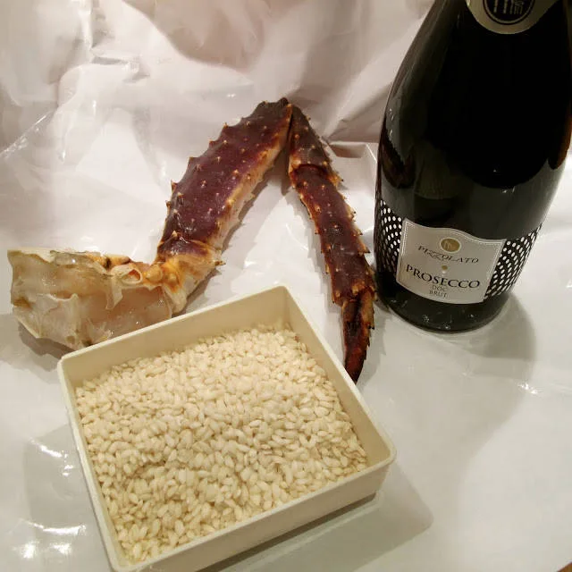 Jeg kjøper helst rå kongekrabbe hvis jeg kommer over det. Da kan jeg steke den i pannen og krydre som jeg vil. Et bein er nok til 2-4 personer i denne retten. 200 g risottoris er nok til to personer.