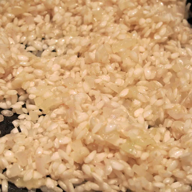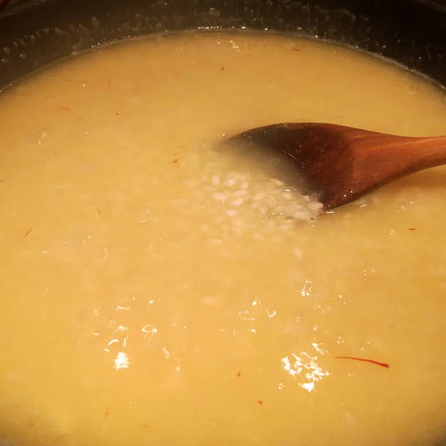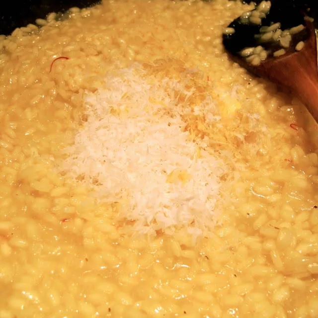 200 g risottoris tilsettes. Skru opp varmen og rør rundt i et par minutter til kornene blir lett gjennomsiktige. Tilsett et kjøkkenglass hvit vermouth, prosecco eller hvitvin, og rør til væsken har trukket inn i risen. Deretter tilsettes en øse kraft. Jobb kraften rolig inn i risen. Tilsett mer kraft og la risen absorbere kraften mellom hver øse. Bruk ca. l liter kraft, kanskje litt mer. Bland inn safrantråder for å få en deilig smak til risottoen. 5-6 tråder. Rør forsiktig i ca. 15-20 minutter. Ta pannen av varmen. Mens risottoen fremdeles er litt fuktig tilsettes 35 g smør og 50 g parmesan. Riv skallet av 1/2 sitron og finhakk 3 ss bladpersille. Rør dette godt inn.