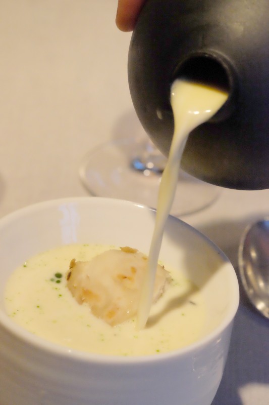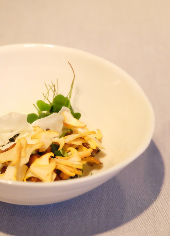 Daniel må tilbake til kjøkkenet og vi kan sette oss i til bords i den lille, men koselige spisestuen. Både musikken (japanskinspirert) og kunsten på veggene er nøye utvalgt av Daniel Berlin. Den skal formidle en historie akkurat slik maten også skal. Han skifter kunst og musikk hvert år.