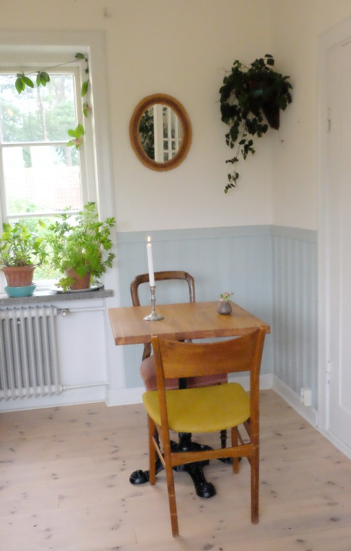 Så strekker vi på beina igjen og blir ført inn i drivhuset i enden av kjøkkenhagen. Det er en rolig stemning i huset og det spilles deilig musikk til kaffen og de siste dessertene. Selvsagt får vi sjokolade fra Österlen Choklad, som holder til rett nede i veien.