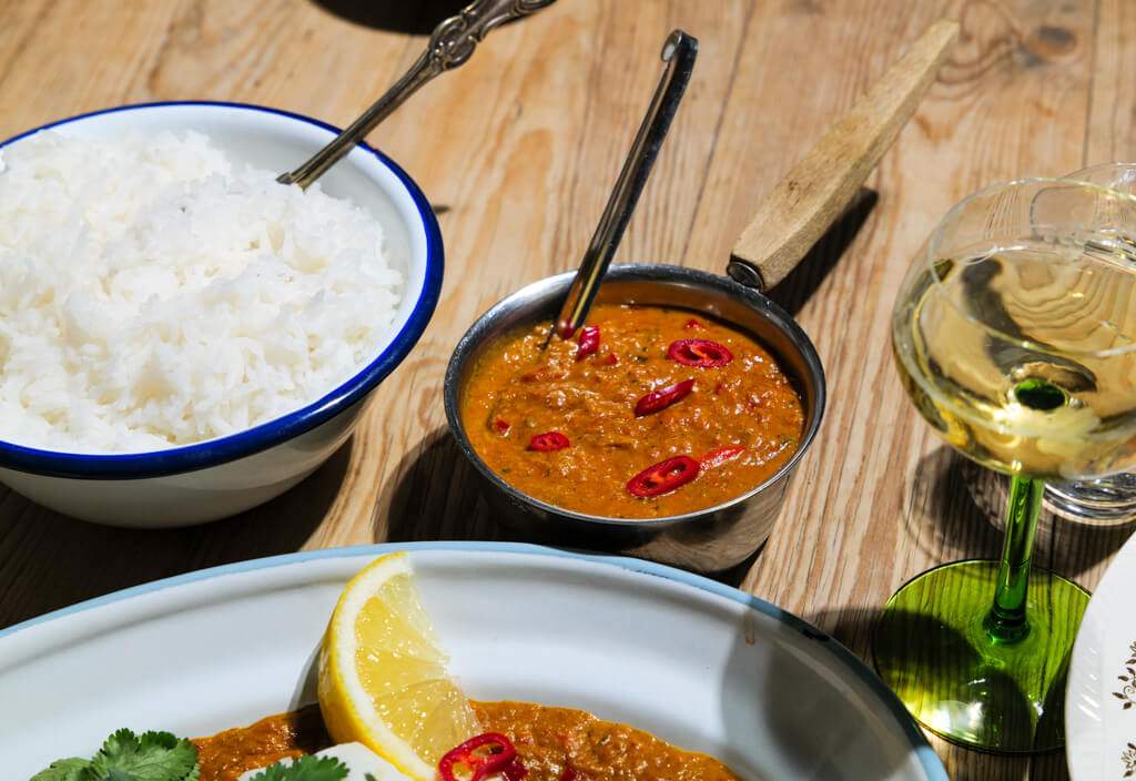 Fisken saltet jeg og pakket inn i bakepapir og hyssing slik at fisken damper inne i papiret. Mitt stykke fisk var tykt og deilig og det var perfekt etter 20 min i ovnen på 180 grader. Sausen: ha et par ss olje i en gryte/panne/wok. Tilsett revet løk og surr til løken er myk. Tilsett hvitløk, ingefær, krydder, timian, chili og paprika. La dette surre under omrøring. Hell på tomater og rør et minutts tid før du heller på tamarind (hvis du bruker det) og peanøttsmør. Tilsett kokosmelk og la sausen surre på medium varme i en god halvtime eller mer til smakene har fått utvikle seg. Sausen er ganske mild, men aromatisk. Tilsett mer karripulver hvis du synes den trenger mer pønsj. Hvis du ikke bruker tamarind kan du bruke saften av en sitron i retten rett før servering. Når fisken er dampet legger du den på toppen av sausen og drysser masse frisk koriander over og serverer med basmatiris. Drikketips: Vi drakk en nydelig jura-vin til. Dog ikke en vin jaune. Vi gikk for denne: Baud Les Prémices 2019. En nydelig match til fisken og currysausen. Skrei med currysaus