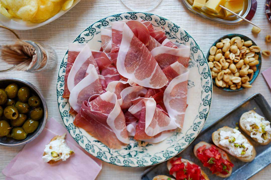 Sett frem en skål peanøtter, salt potetgull, gode oliven og selvsagt et pent fat med deilige tynne skiver Prosciutto di Parma.