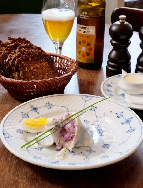 Walter guider meg igjennom 5-retters menyen de serverer under Copenhagen Cooking. Først starter man med sild. Mange, og kanskje især nordmenn, går rett på de tyngre rettene slik som ribbensteg og lun leverpostei. Skal man spise en ekte dansk frokost starter man med retter fra havet, og så går man videre til kjøtt, gjerne via jord (poteter). Det er ingen ribbensteg og lun leverpostei på Restaurant Kronborgs spesialmeny, men á la carte-menyen deres har alt, så slapp helt av.