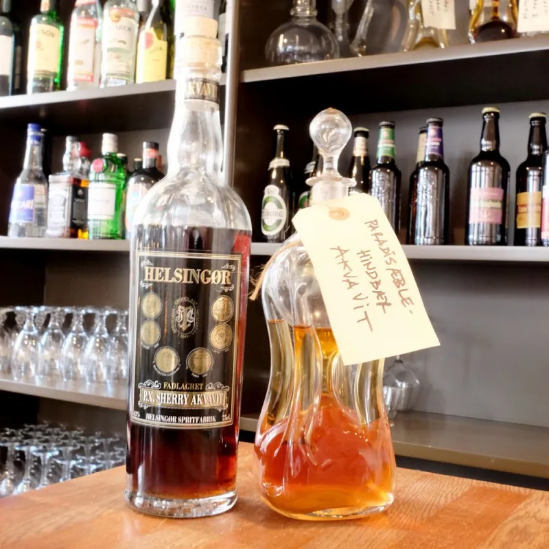 Snapsene de serverer på restauranten er så populære at mange kjøper en flaske med seg hjem. De er spesiallaget av en personlighet i Helsingør som gjerne sanker granskudd i skogen for å lage snaps på dem. Man må bare digge slike mennesker.