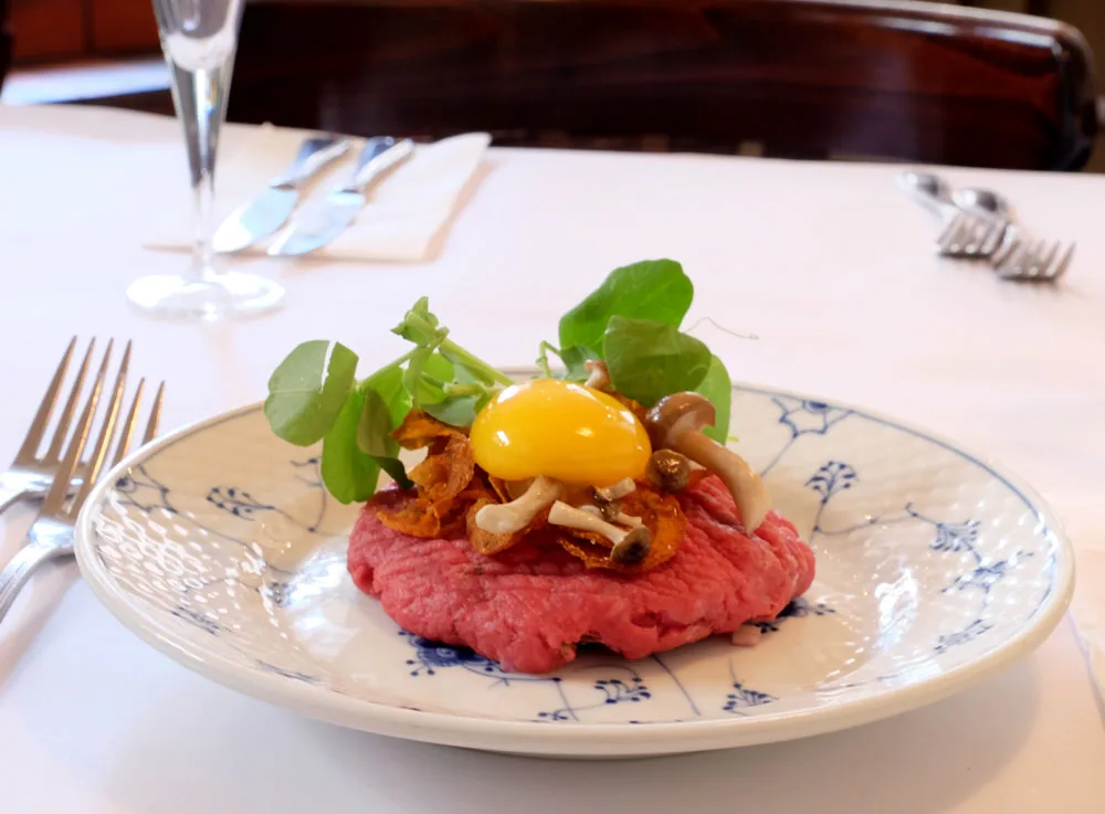 Etter fisken går man over til kjøttet. De serverer en deilig tartar som kjøttrett. Tartar er virkelig populært i Danmark, og du vil kunne se en slik rett i mange spennende variasjoner på menyene i København om dagen. Tartar-burger er blitt oppservert på Kødbyens lørdagsmarked, så dette er hipt! Hjemme kan man knapt få tartar hvis man da ikke går på steder som Theatercaféen eller Grand. Ingen under 50 år spiser tartar hjemme. Her er det motemat.
