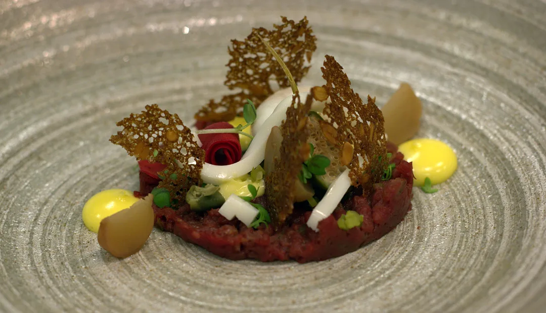 Presentasjon: Elgtartaren legges i midten av tallerknen. Bruk en utstikker-ring for perfekt resultat. Dandér med garnityr og eggeplomme-krem .
