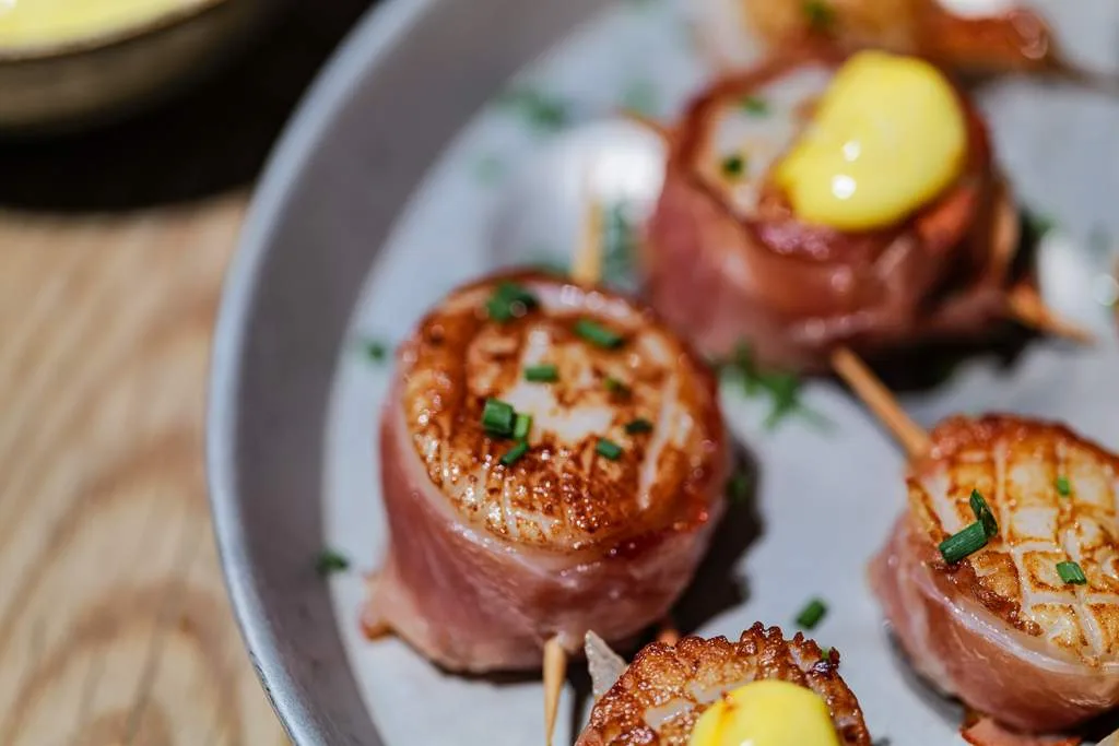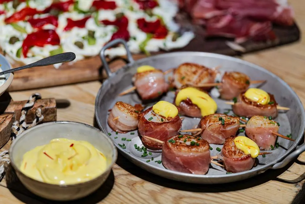 Serranoskinke Delizias, skivet, lagret i 12 mnd (120 g) bruker jeg i kombinasjon med kamskjell. Sjømat og spekeskinke er en fantastisk match. Skinken er myk nok til lett å formes rundt kamskjellene og festes med cocktailpinne før de stekes. Til denne retten lagde jeg en deilig majones med safran og bakt hvitløk.