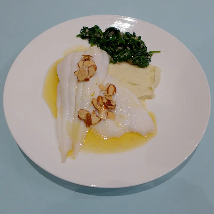 Server fisken med puréen, spinaten og smøret med mandleflakene.